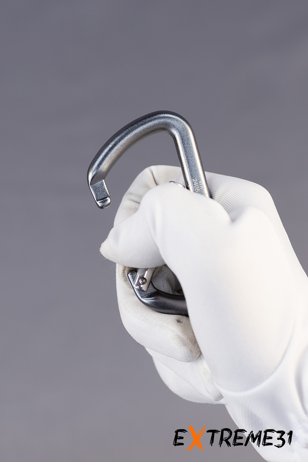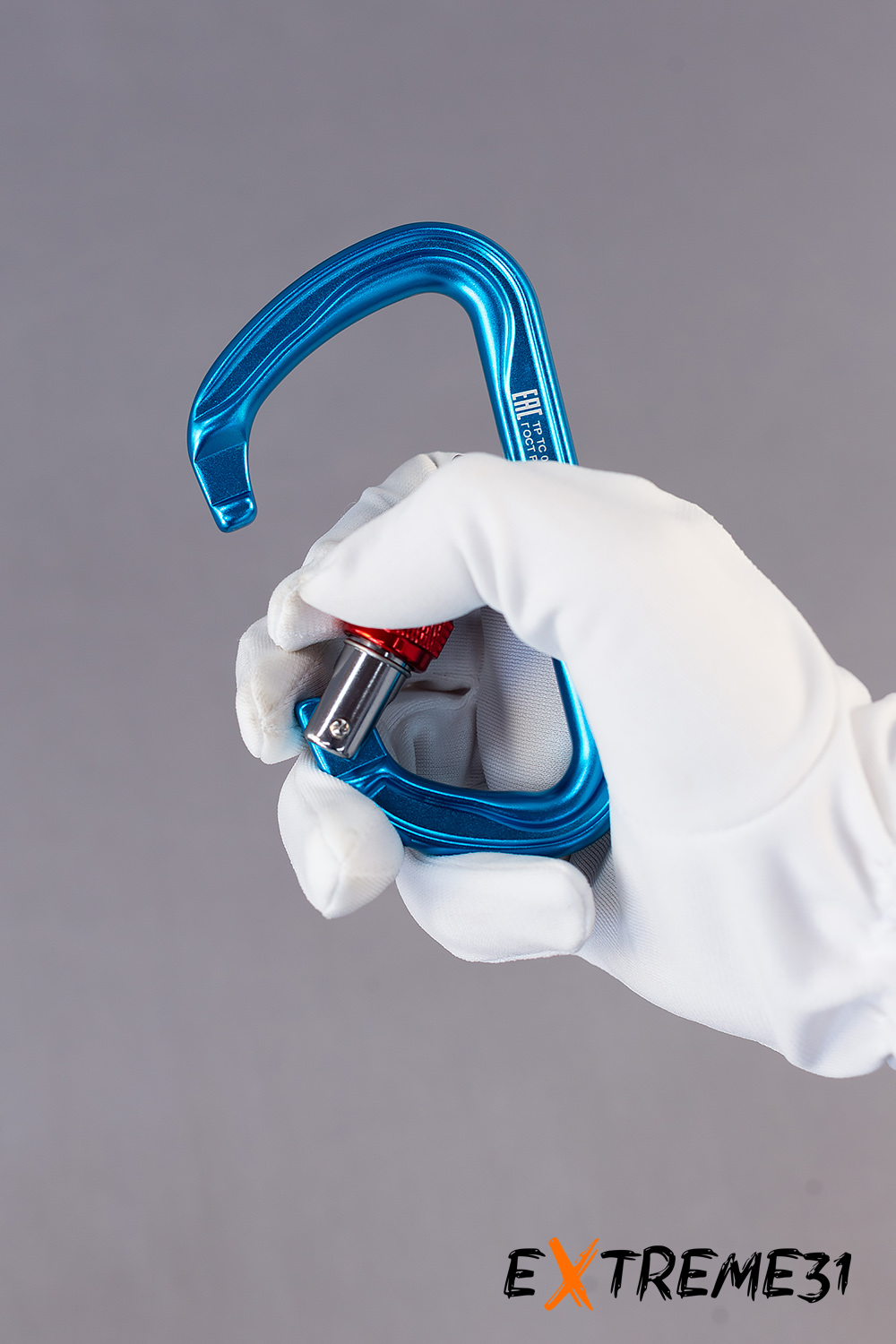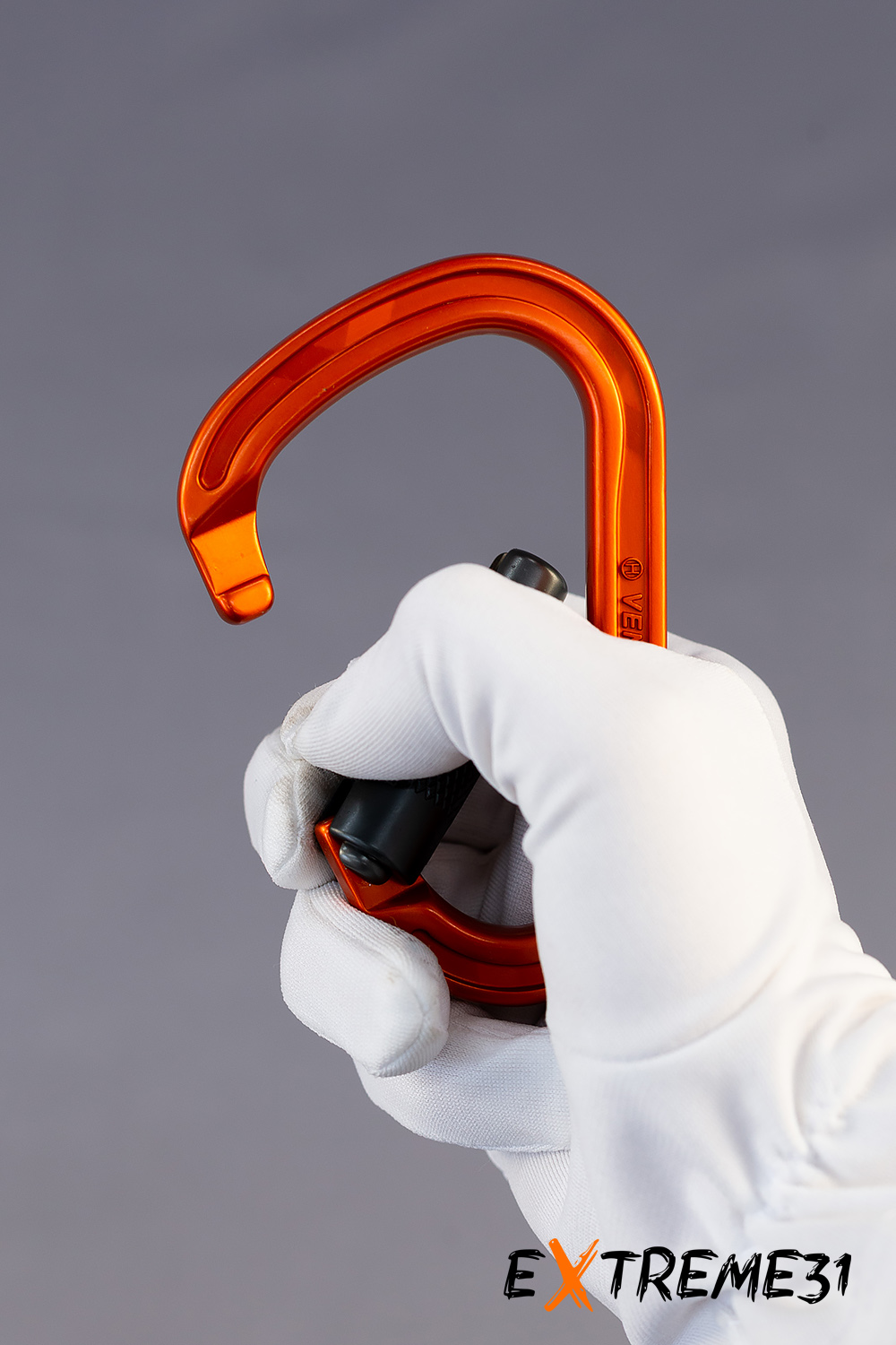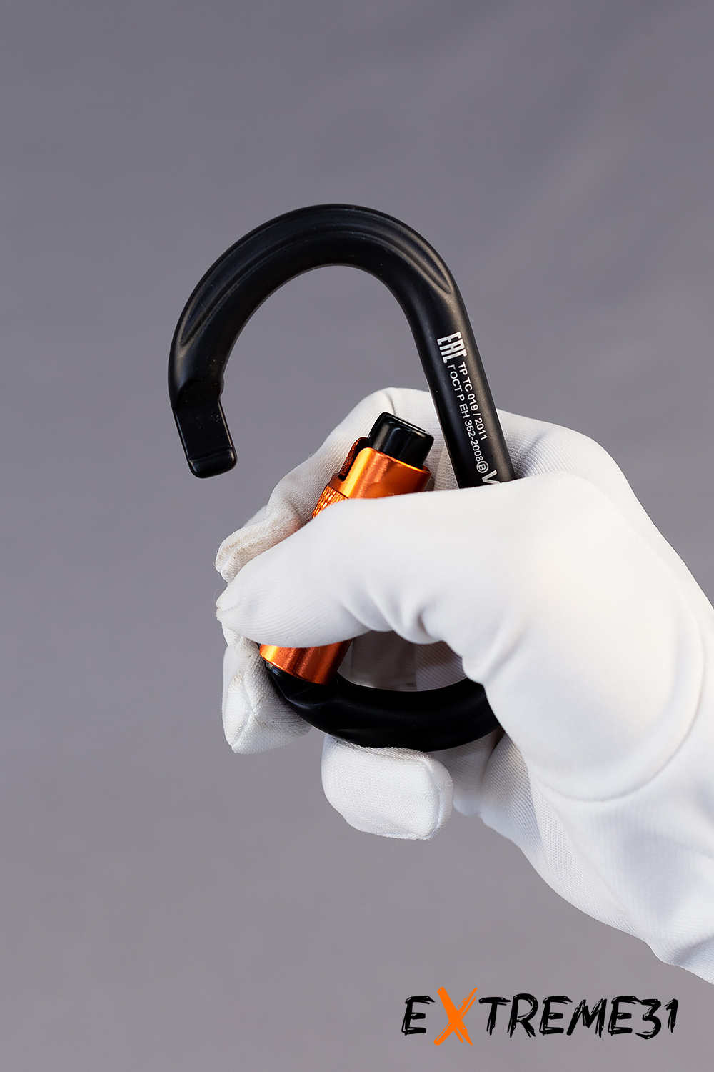 Легко открывается простым движением одного пальца. Эргономичная форма карабина - хорошо ложится в руку, обеспечивает оптимальную работу с карабином. Большое раскрытие облегчает пристегивание к толстым тросам.