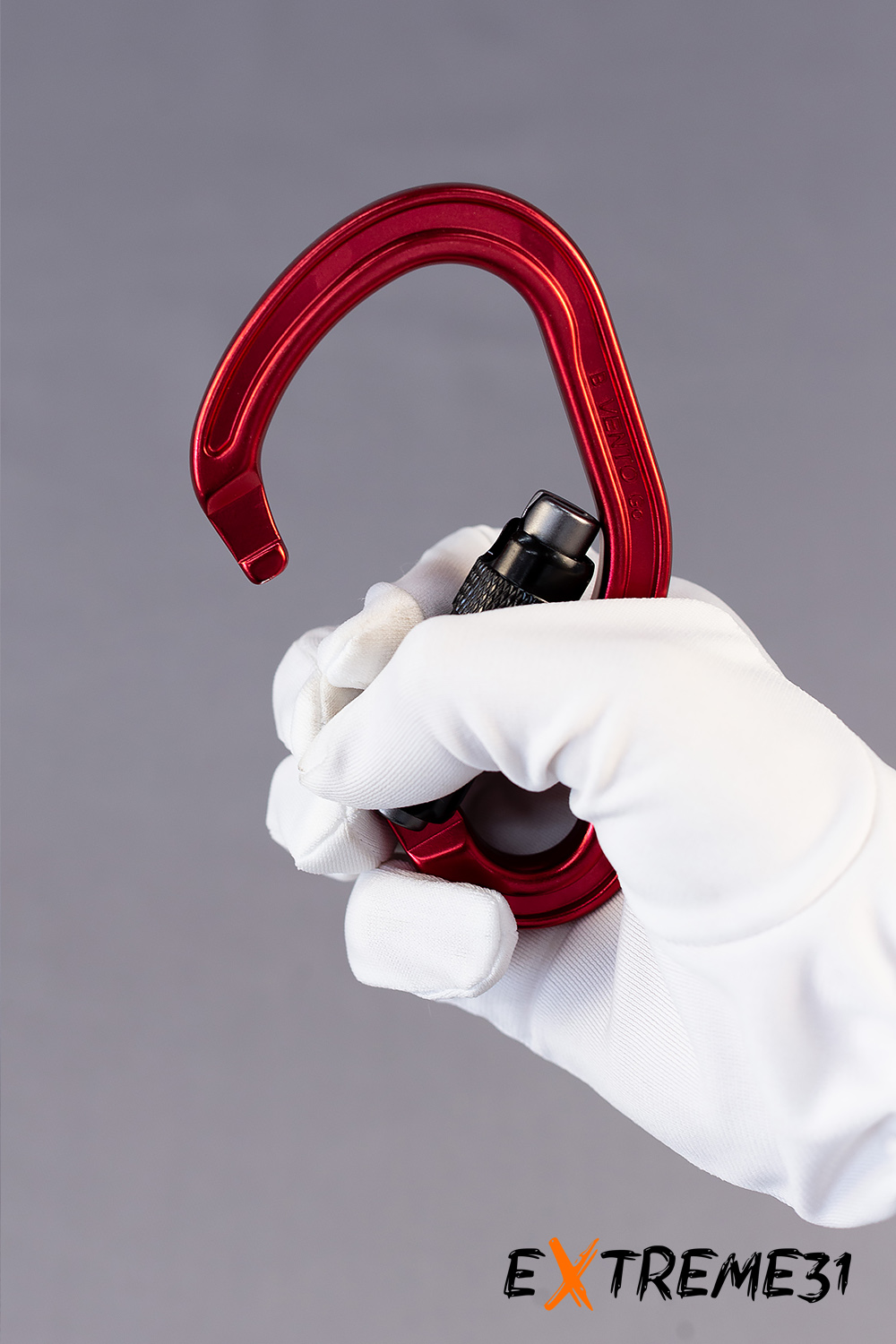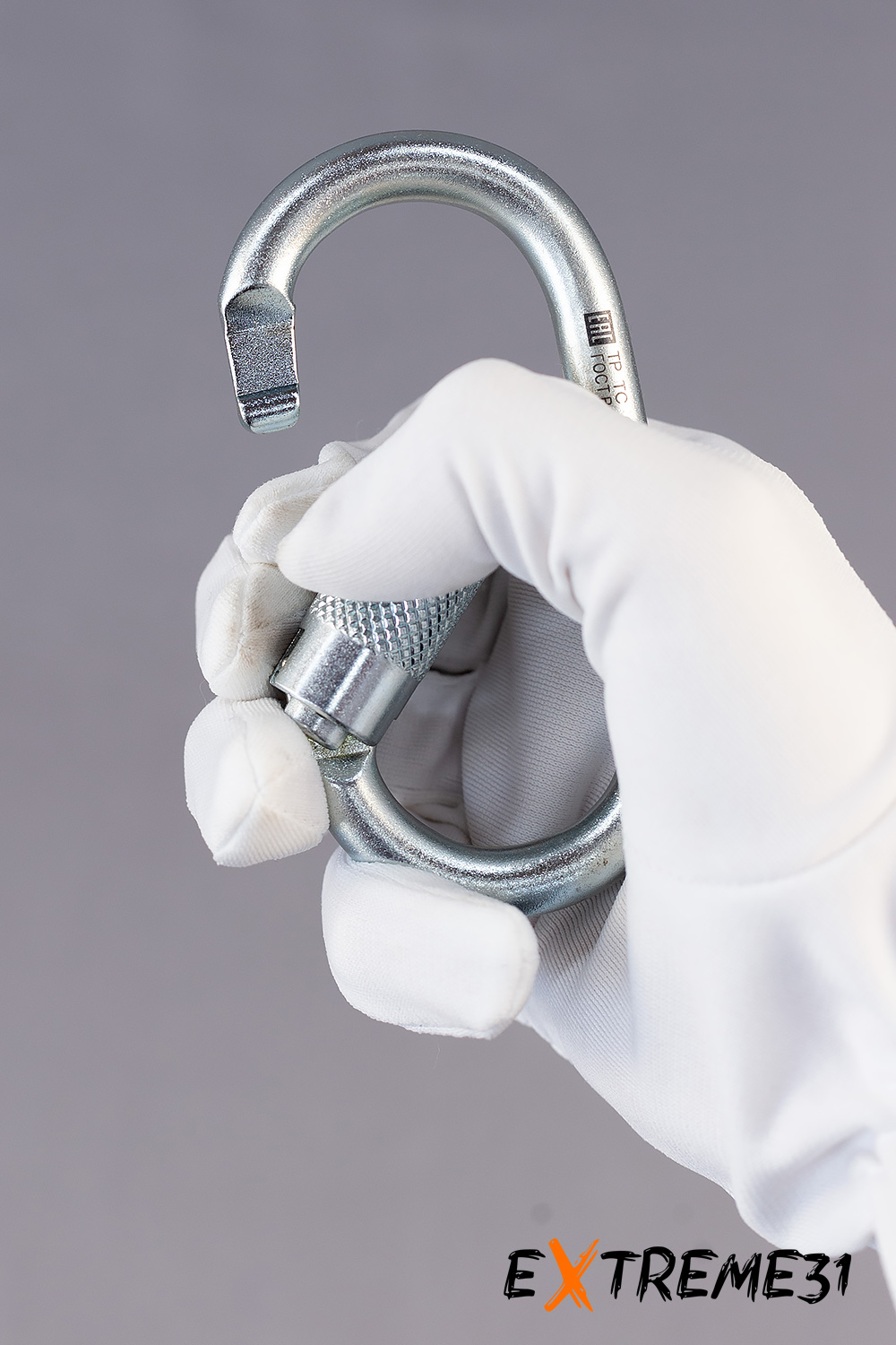 Карабин «Гусь» с резьбовой муфтой для использования на усах самостраховки. Форма карабина обеспечивает удобство использования.