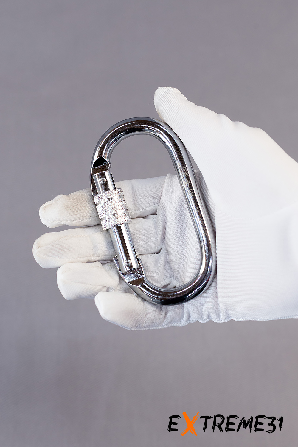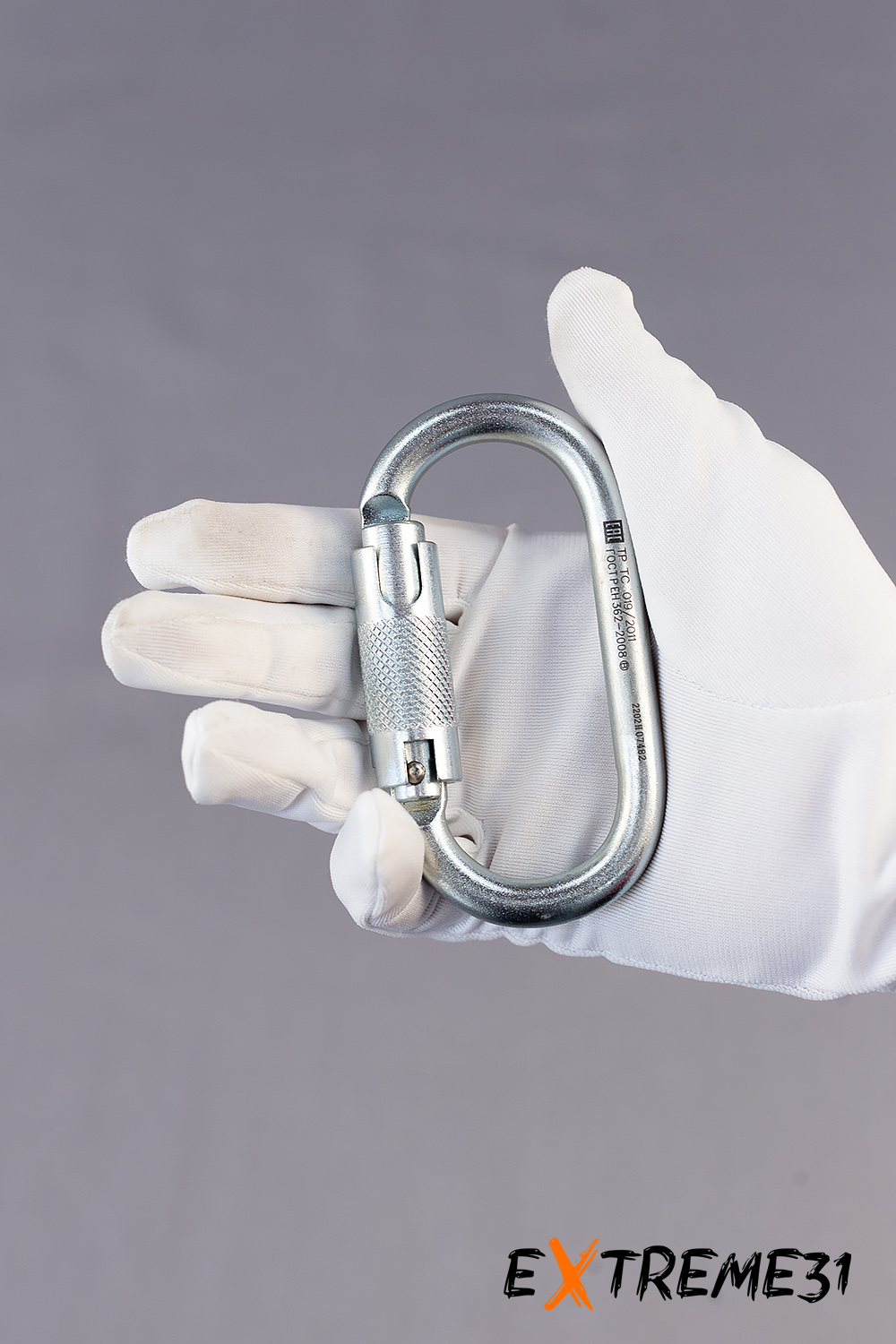 Стальной карабин овальной формы. Прямая защёлка с резьбовой муфтой. Карабин имеет сертификат ЕАС.