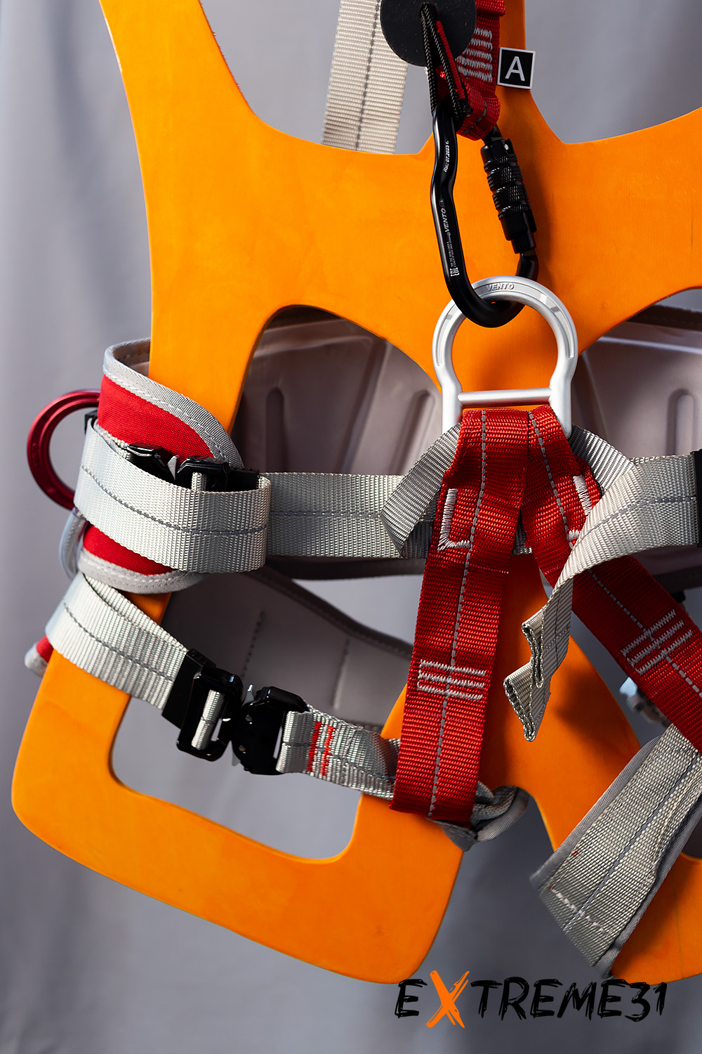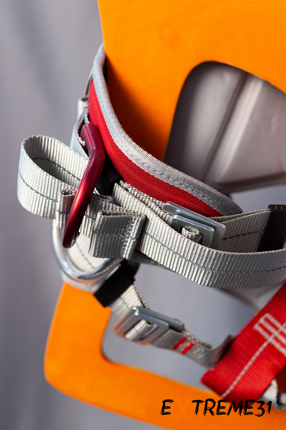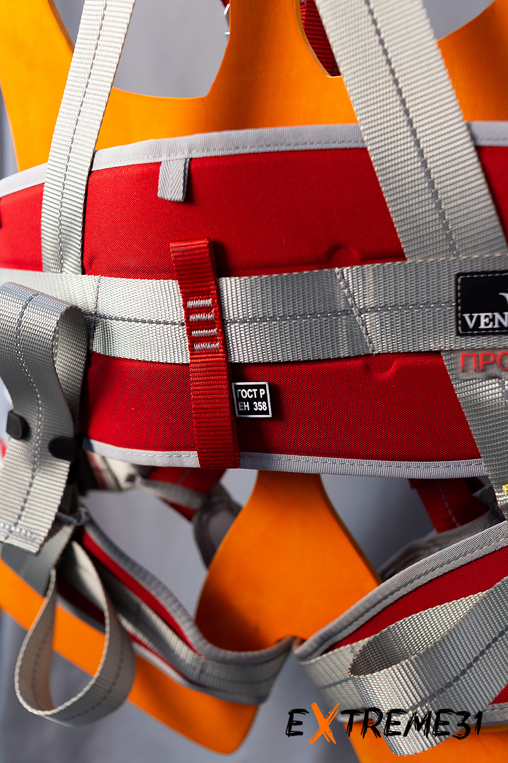 Привязь предусматривает возможность интеграции рабочего сиденья для длительных работ в безопорном пространстве. На поясе расположены петли для развески дополнительного оборудования.