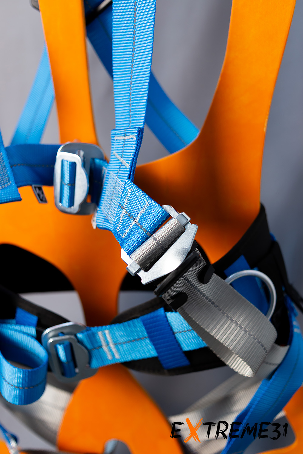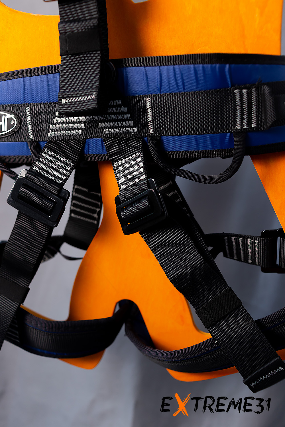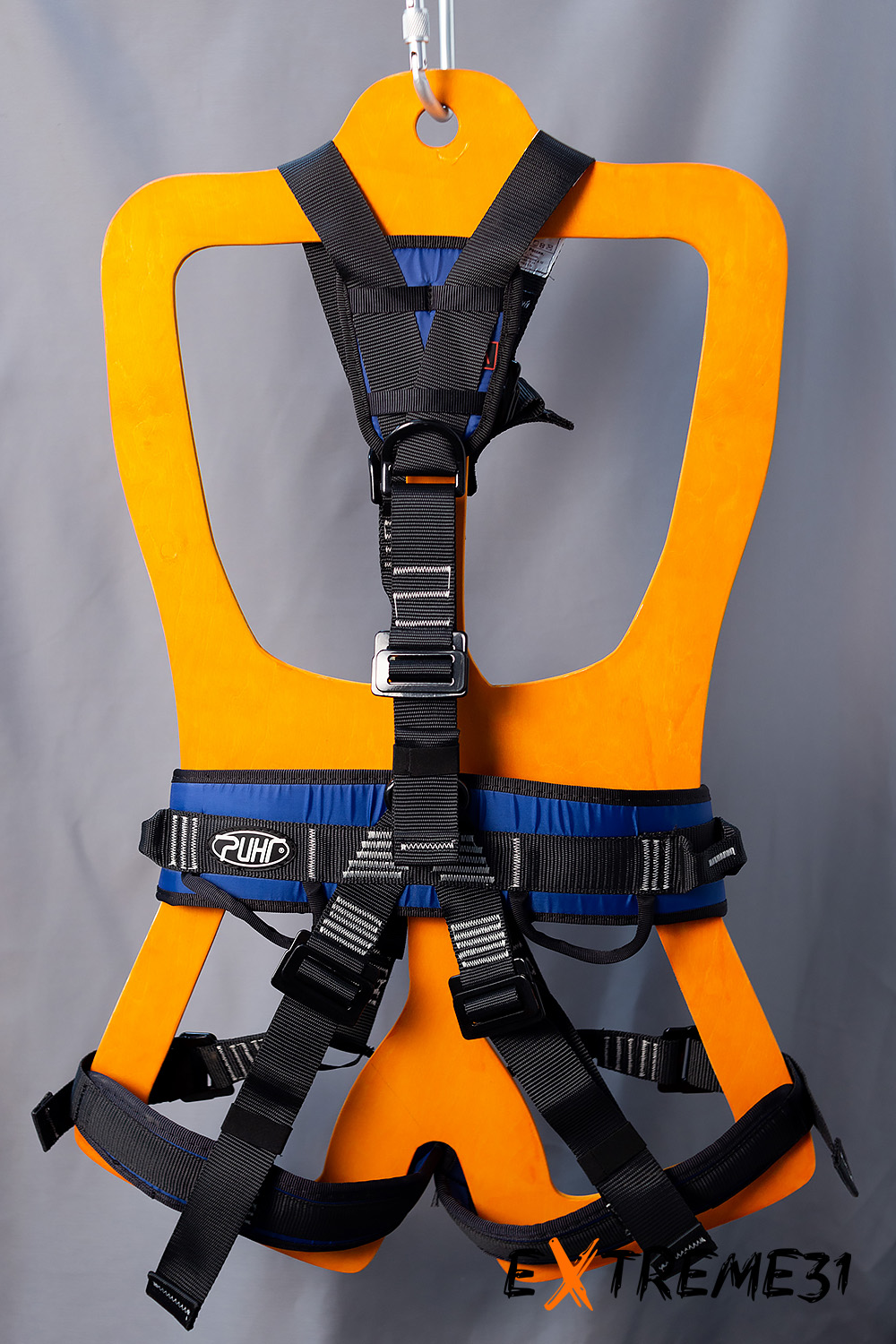 Удобная комфортная полная страховочная система для промышленного альпинизма и спасательных работ с удобными поясным и ножными обхватами, пятью точками крепления и развесочными петлями.
