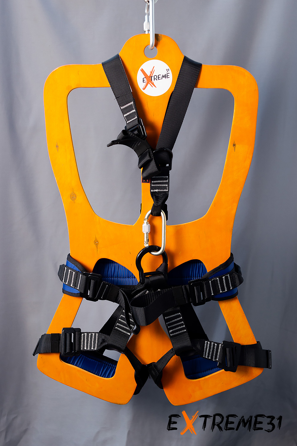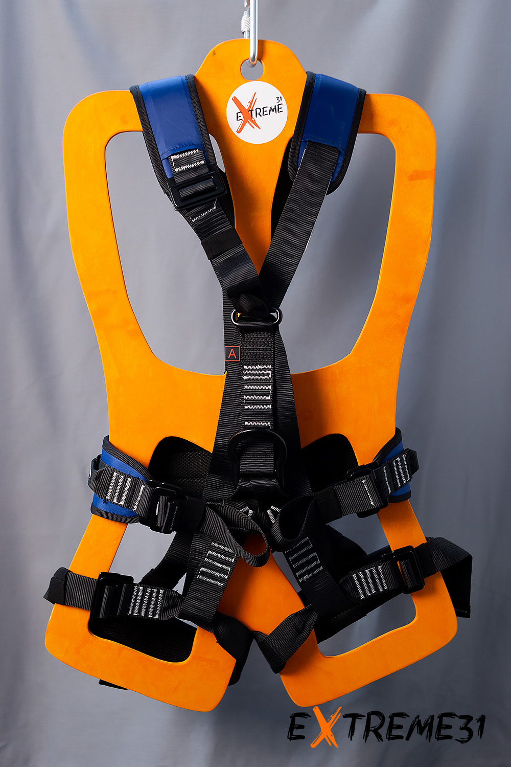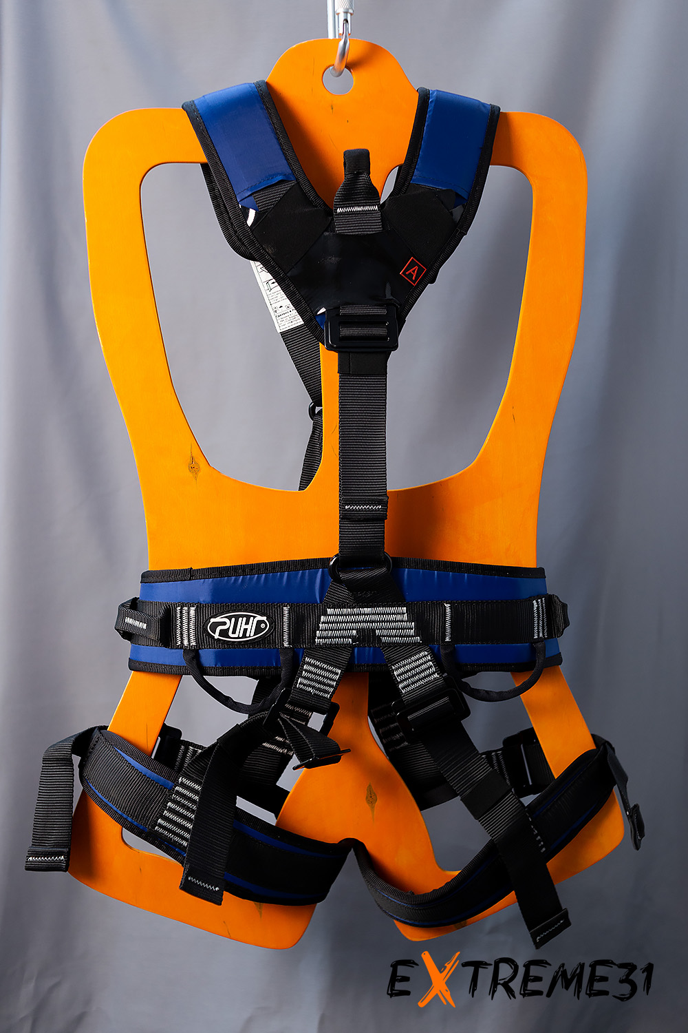 Удобная комфортная полная страховочная система для промышленного альпинизма и спасательных работ с удобными поясным и ножными обхватами, пятью точками крепления и развесочными петлями.